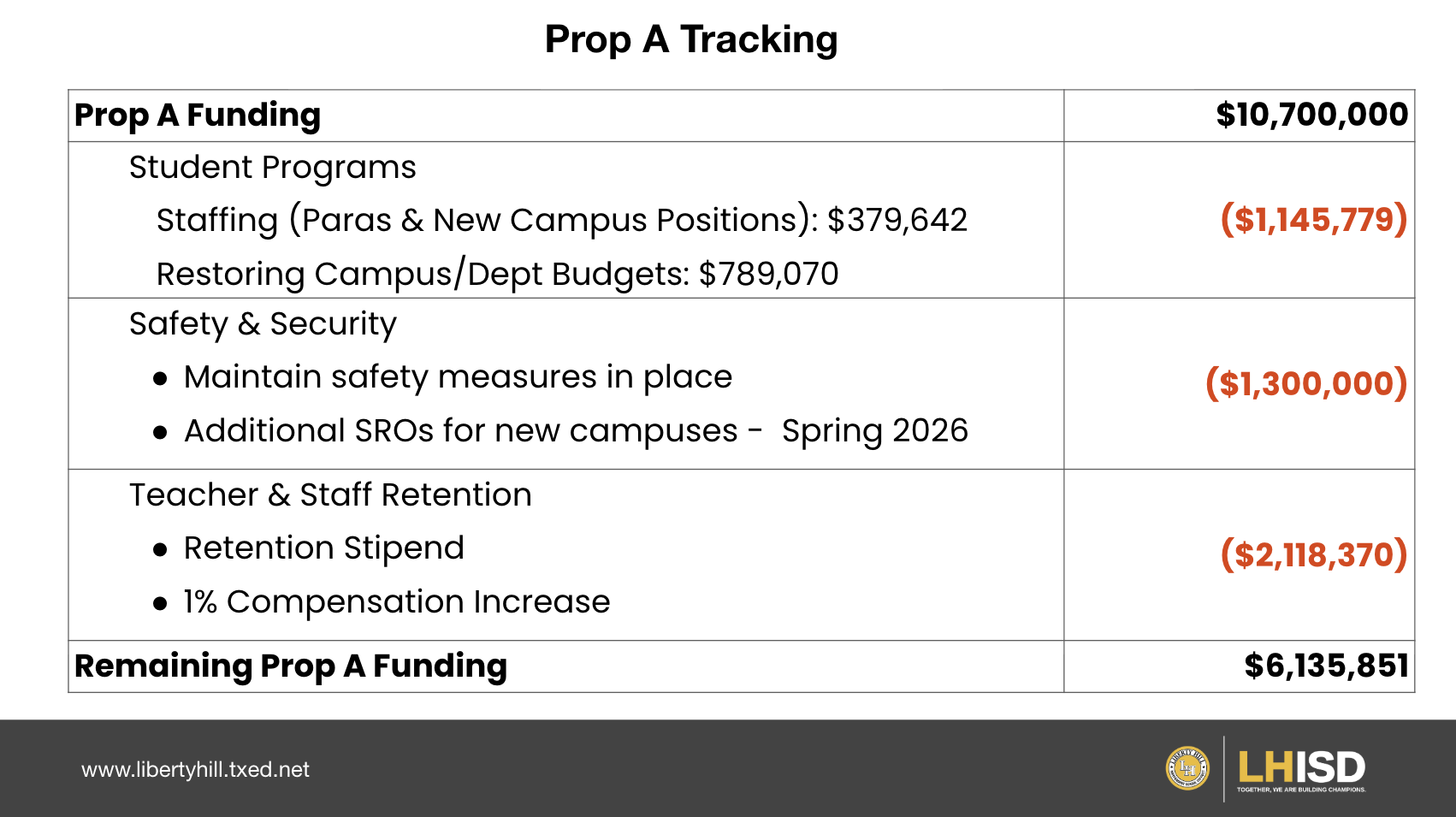 The Liberty Hill ISD board of trustees is committed to keeping an armed police officer at each campus and the funds from Prop A allows the district to keep this commitment.